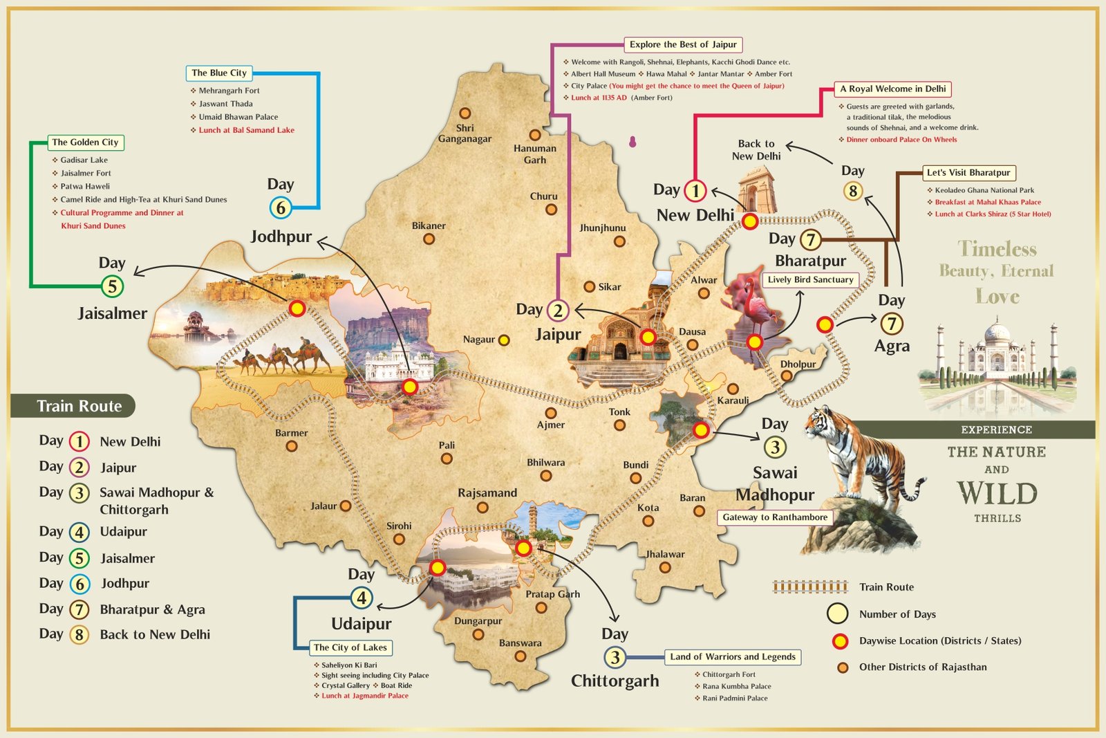 The royal train tour map of India allows you to explore the heritage of Rajasthan and the historical beauty of Uttar Pradesh. To preview this remarkable journey, you refer to the map of Palace of Wheels journey. Highlights also include breathtaking views of Ranthambore National Park near Sawai Madhopur and the renowned Keoladeo bird sanctuary in Bharatpur.